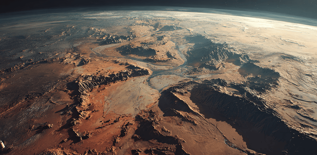 aerial shot of mars from space as if taken for a documentary with a 1974 movie film grain, don't include any spaceships or objects in the foreground --ar 3:2