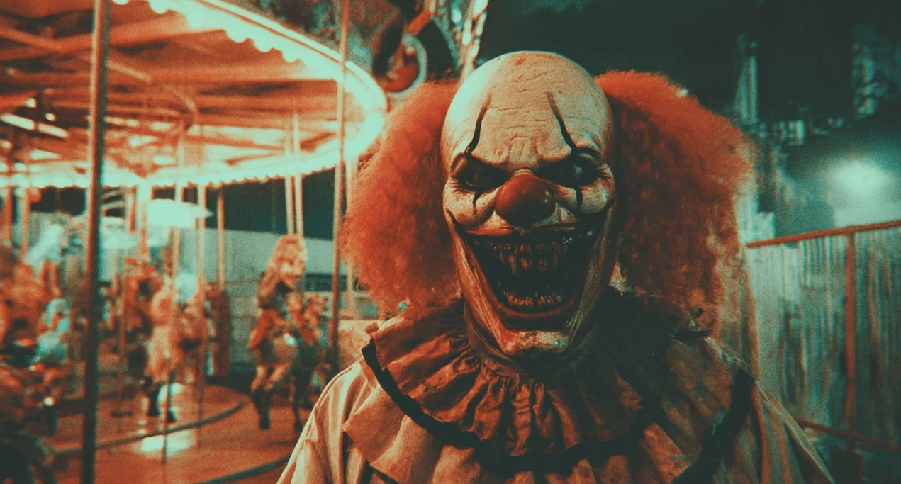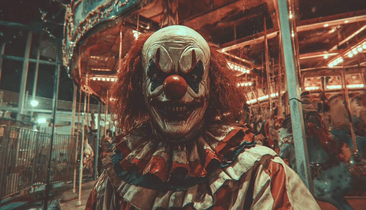 horrific abandoned amusement park, abomination terrifying human clown. Photographic evidence real documentary scary creepy, horrific spirit , 1974, film grain, motion blur , night --ar 3:2 --v 7